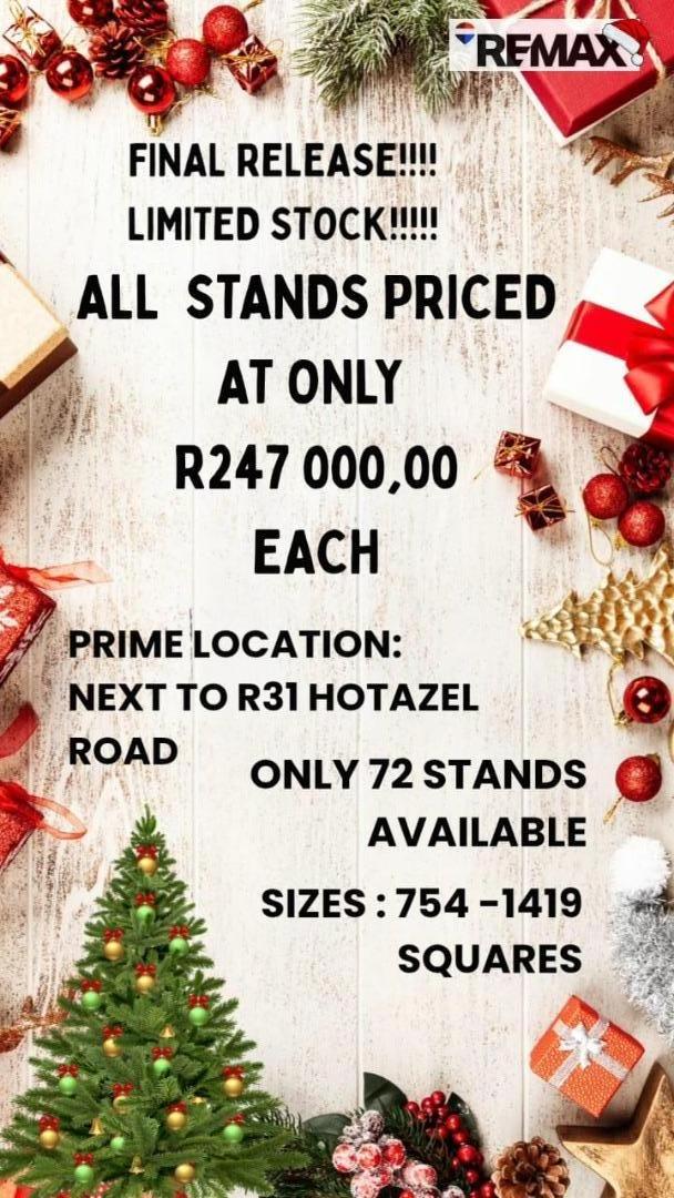 Priced at R247,000.00, this stand represents a valuable investment in a growing region. With only 72 stands available in this final release, prospective buyers are encouraged to act swiftly to secure their piece of this developing residential area. This is a unique chance to establish roots and build.