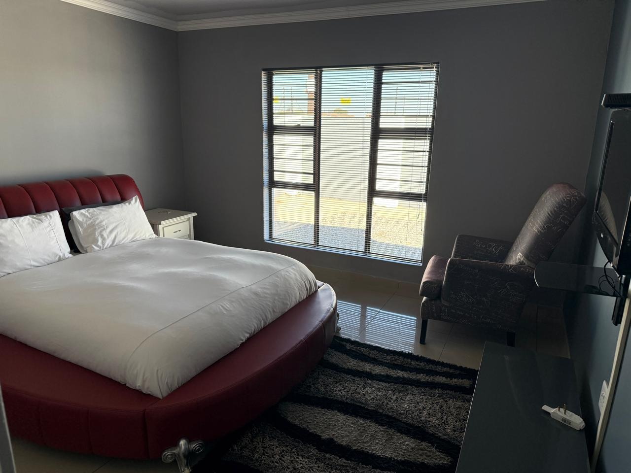Hey there! Check out this super stylish and secure 3-bedroom, 2-bathroom rental home in Mothibistad, Kuruman. It's got a really modern vibe with a sleek grey exterior and a paved driveway, making it look great and easy to maintain.