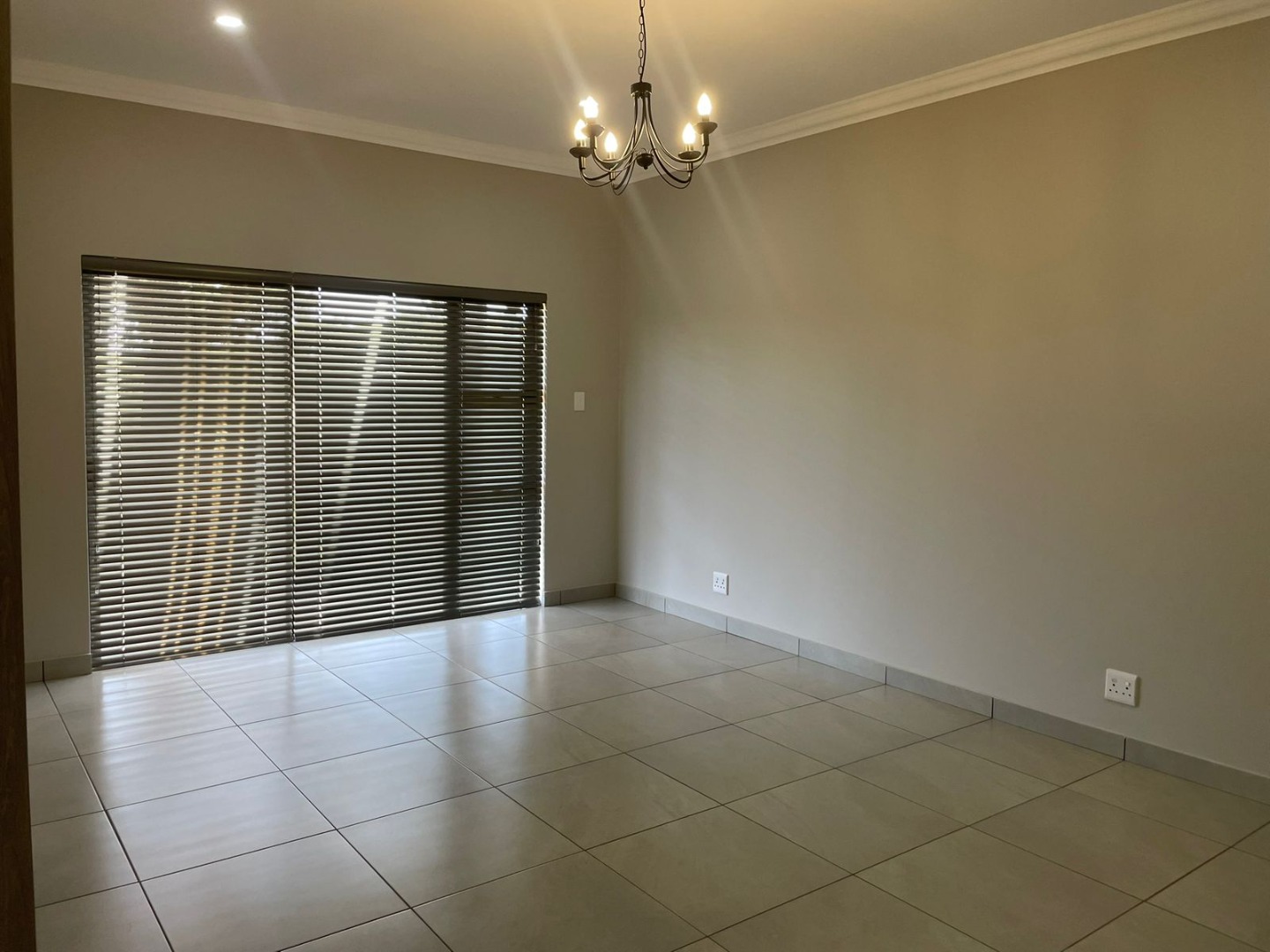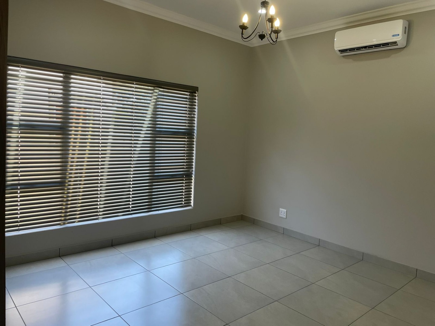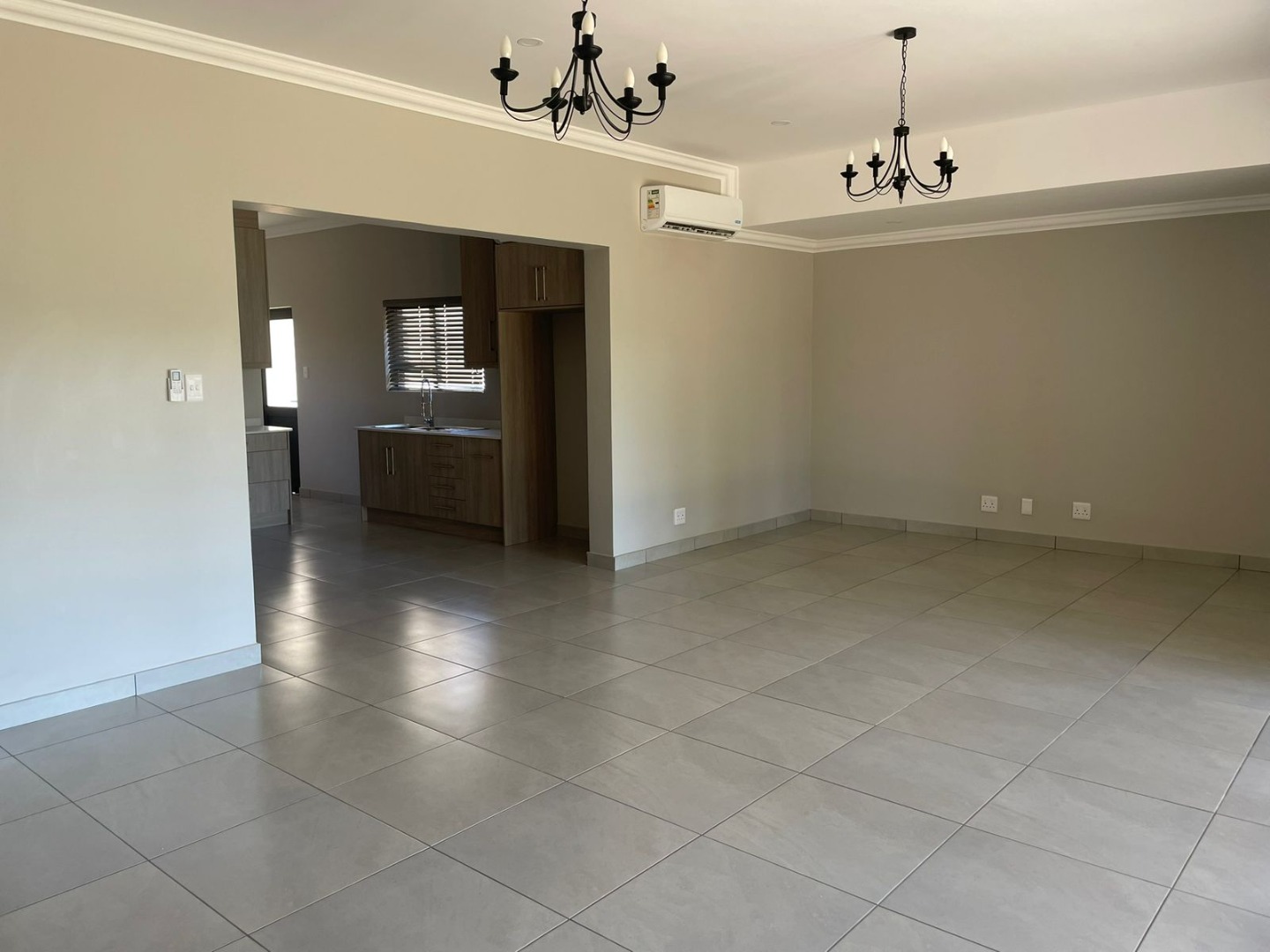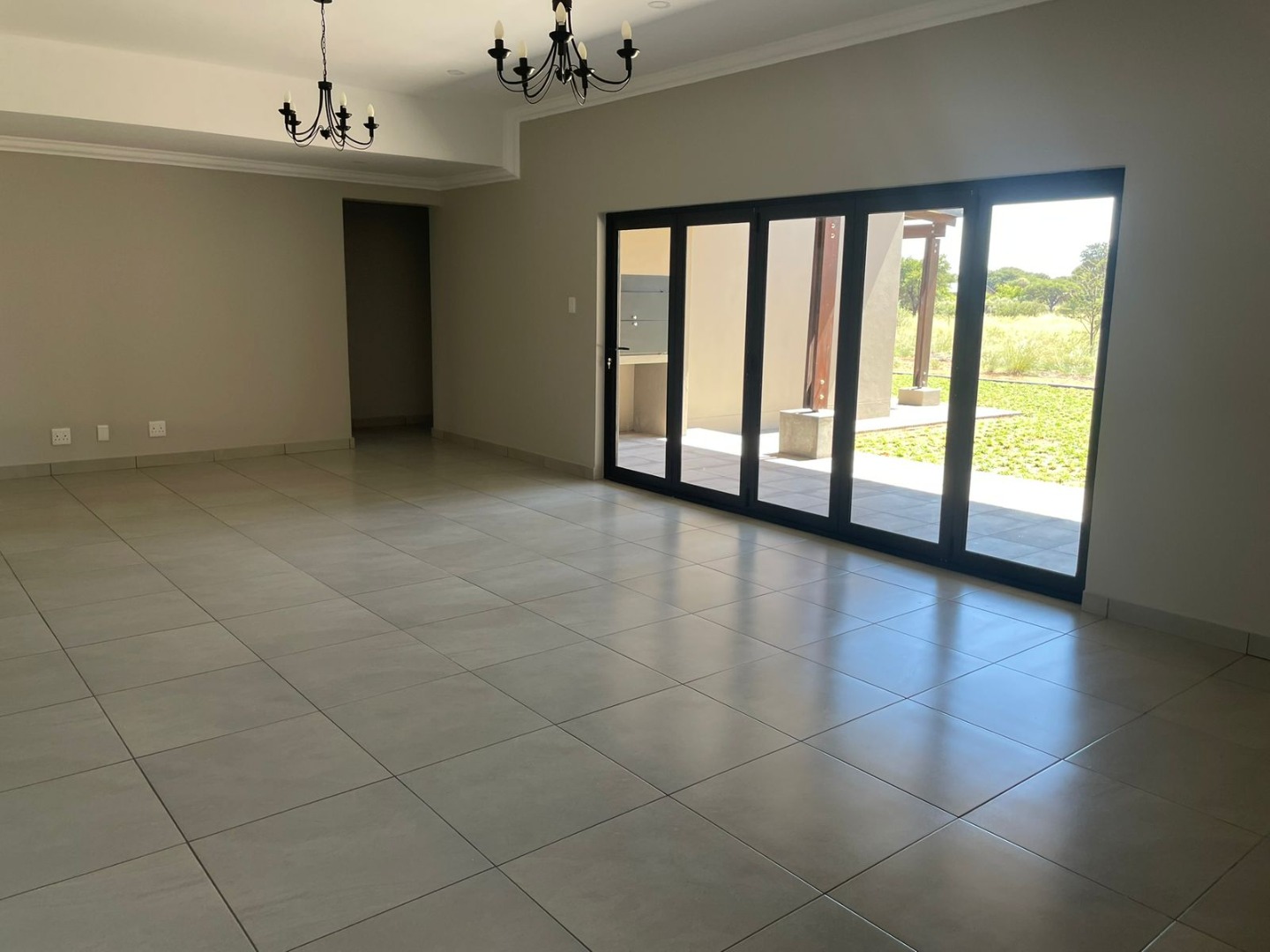 The striking exterior, characterized by sleek grey finishes and a dark metal roof, offers impressive kerb appeal, complemented by a paved driveway leading to an integrated double garage. Step inside to an expansive open-plan living area, bathed in natural light streaming through large bi-fold glass doors. Elegant chandeliers adorn the ceilings, enhancing the neutral aesthetic and tiled floors, creating a seamless flow to the outdoor entertainment spaces. An air conditioning unit ensures year-round comfort.