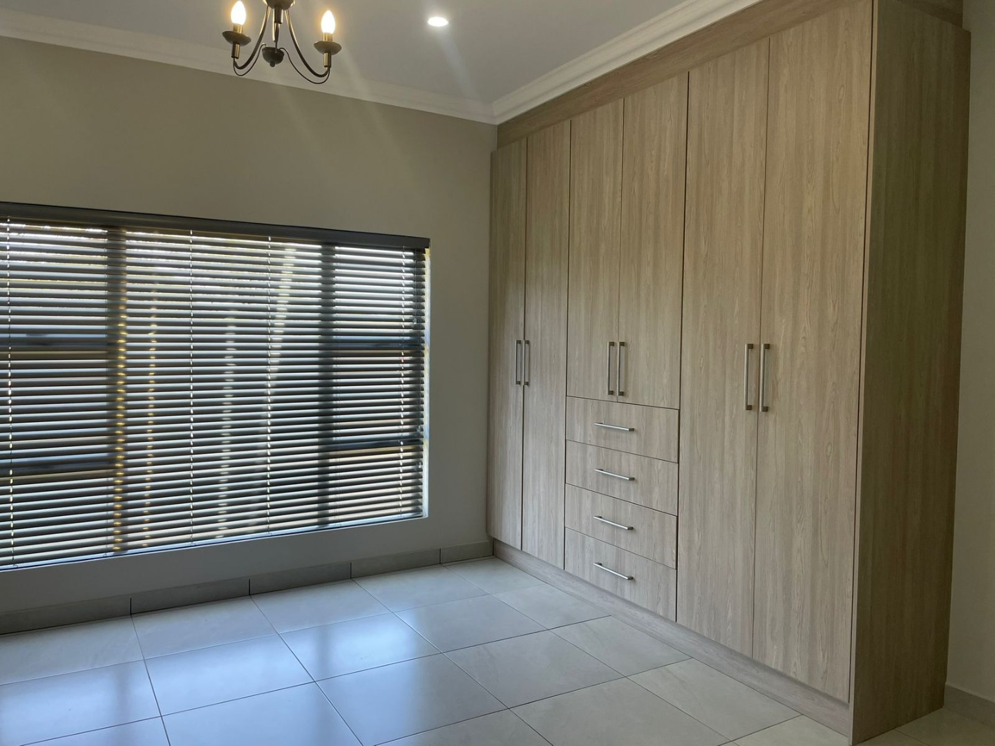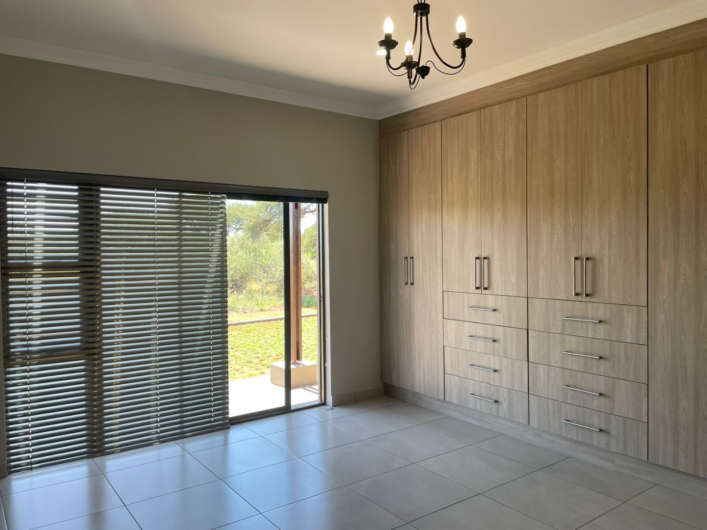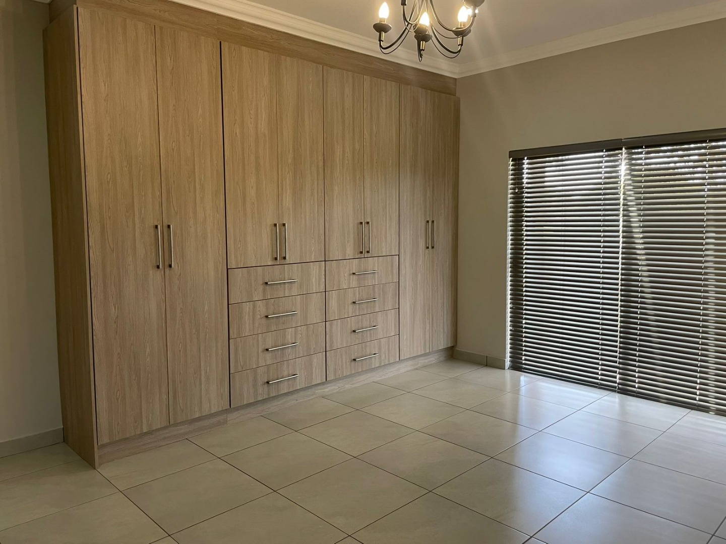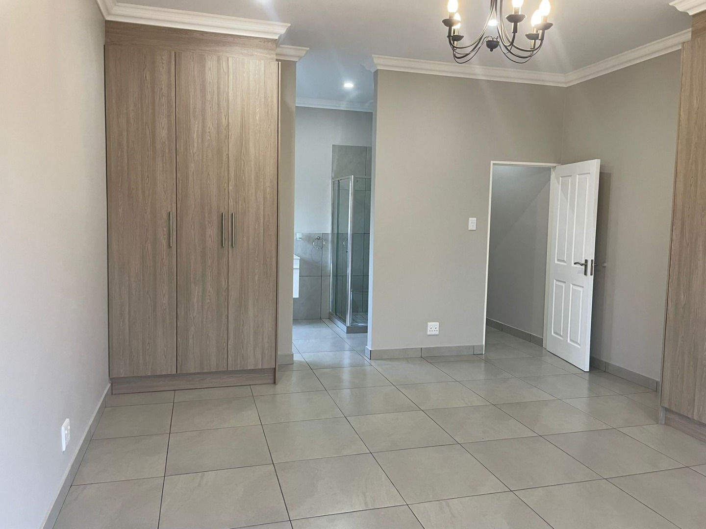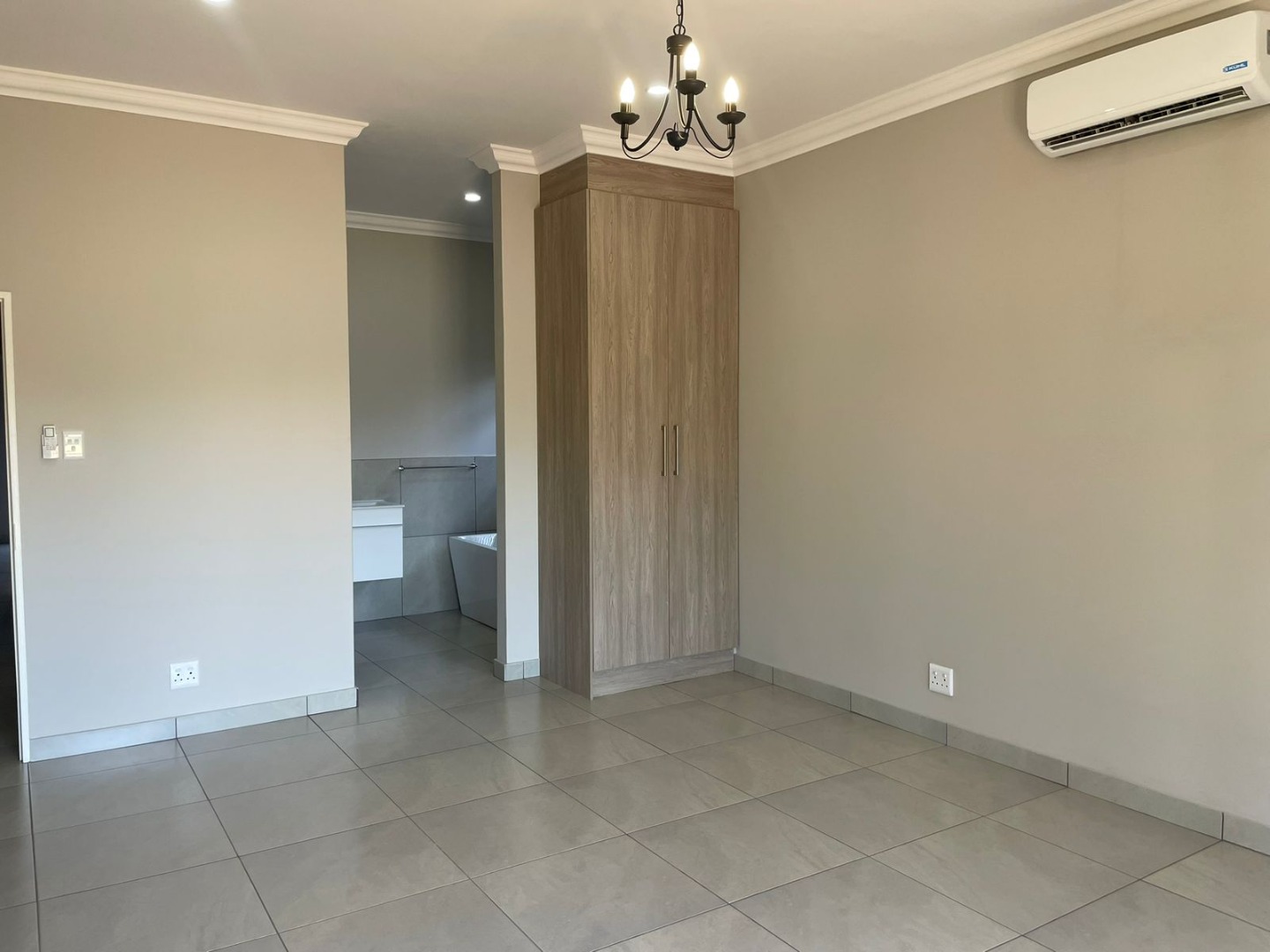 The striking exterior, characterized by sleek grey finishes and a dark metal roof, offers impressive kerb appeal, complemented by a paved driveway leading to an integrated double garage. Step inside to an expansive open-plan living area, bathed in natural light streaming through large bi-fold glass doors. Elegant chandeliers adorn the ceilings, enhancing the neutral aesthetic and tiled floors, creating a seamless flow to the outdoor entertainment spaces. An air conditioning unit ensures year-round comfort.