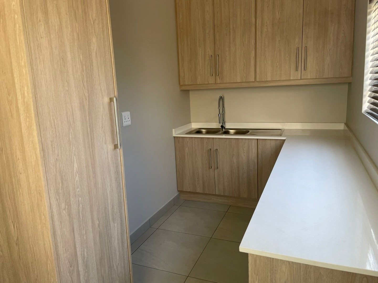 The heart of the home, the kitchen, is a testament to modern design, featuring extensive light wood-grain cabinetry and pristine white countertops. Thoughtfully designed with a double stainless steel sink and a dedicated refrigerator niche, this space awaits your selection of premium appliances to complete its functionality.